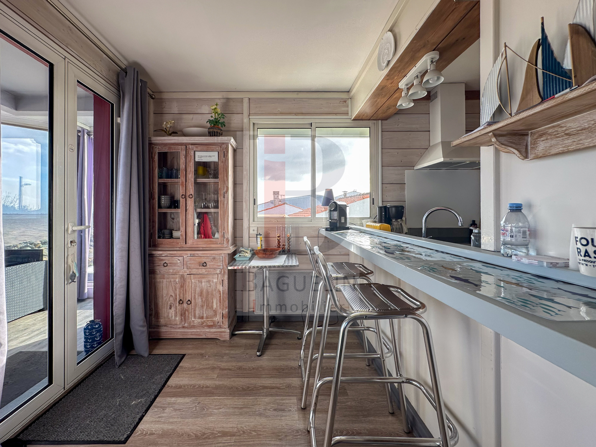 comprenant : véranda, pièce de vie avec cuisine ouverte, chambre avec placard, salle d’eau et wc séparés.