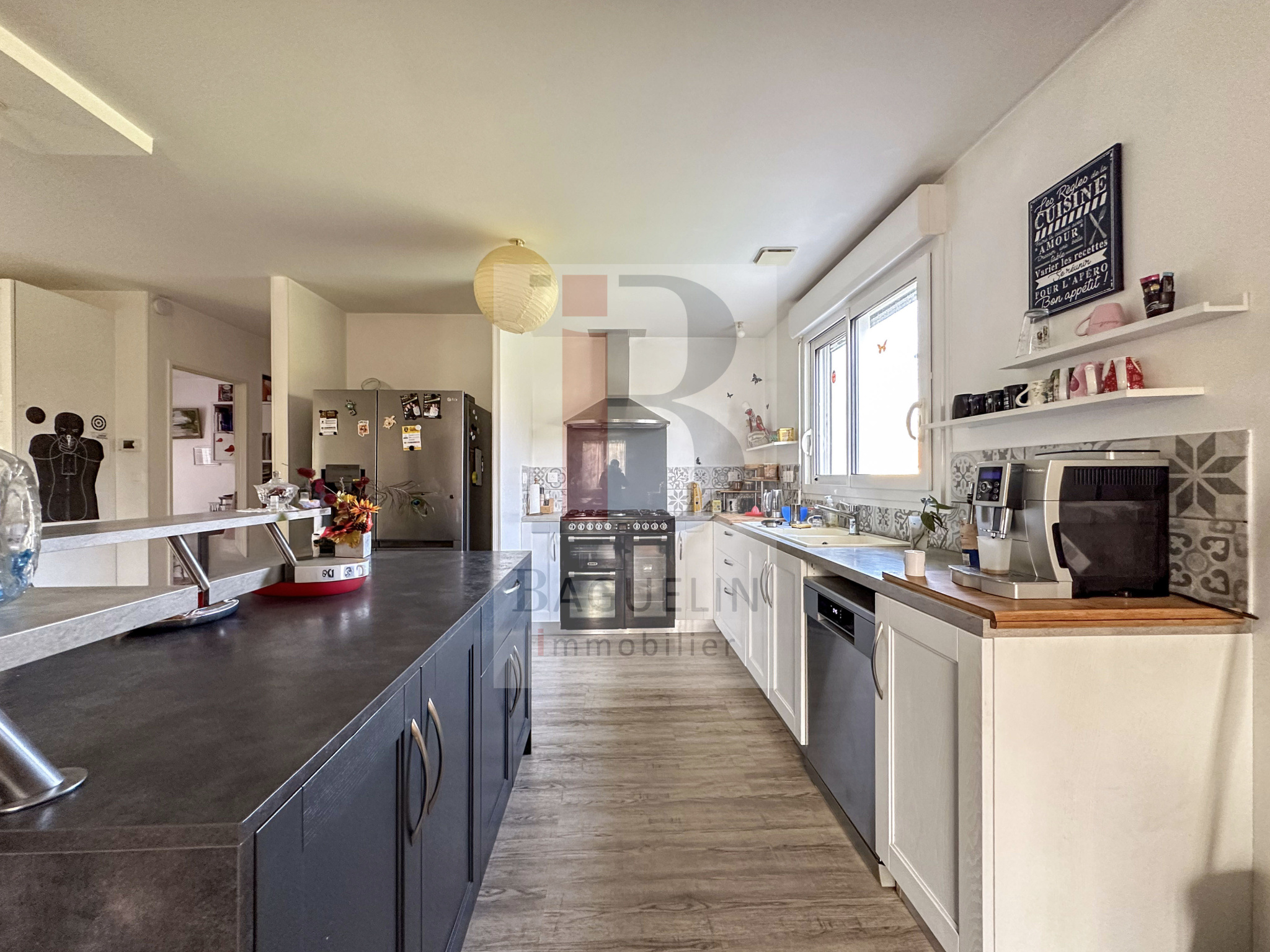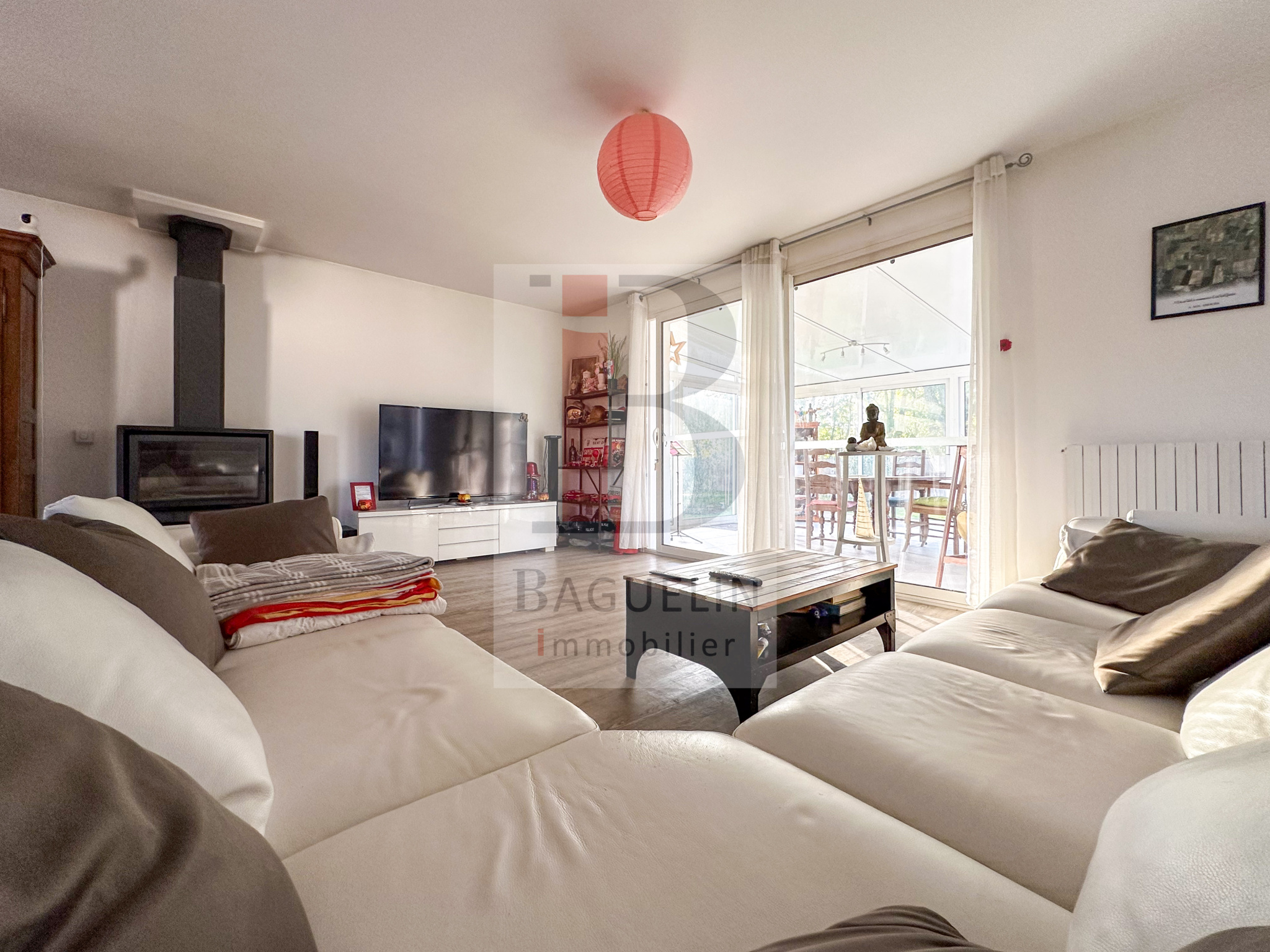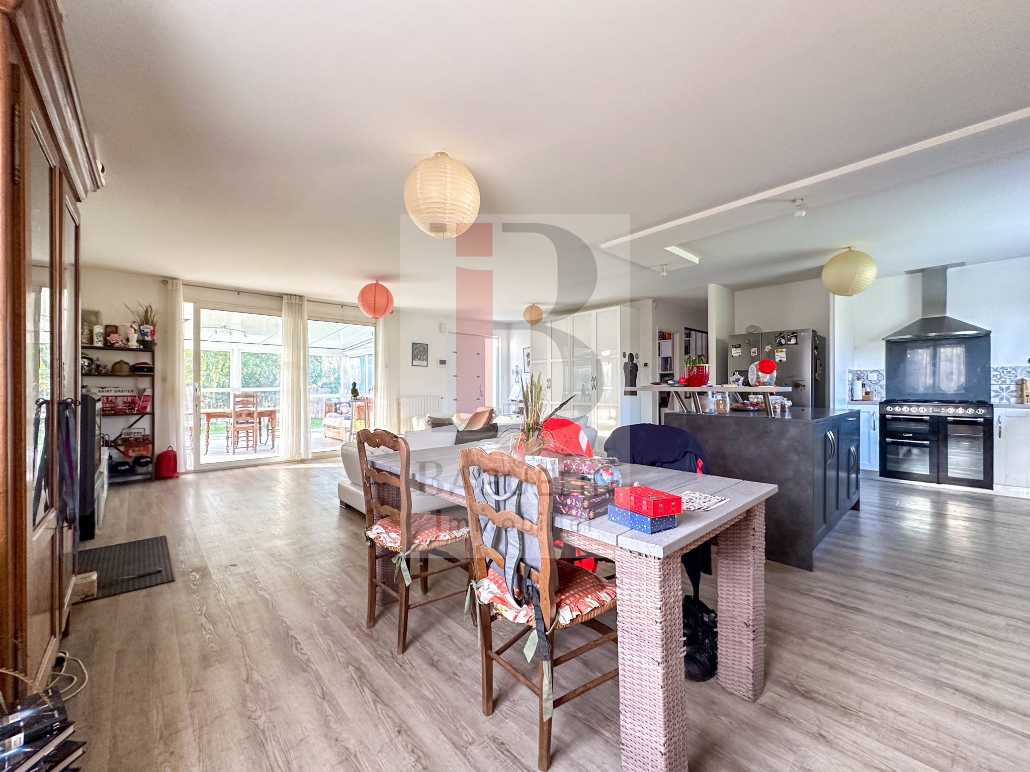 Une grande pièce de vie de 57m2 avec cuisine ouverte aménagée et équipée, une véranda, 3 chambres dont deux avec placards, bureau ou 4ème chambre, une salle d’eau, une salle de bains, 2 WC, .