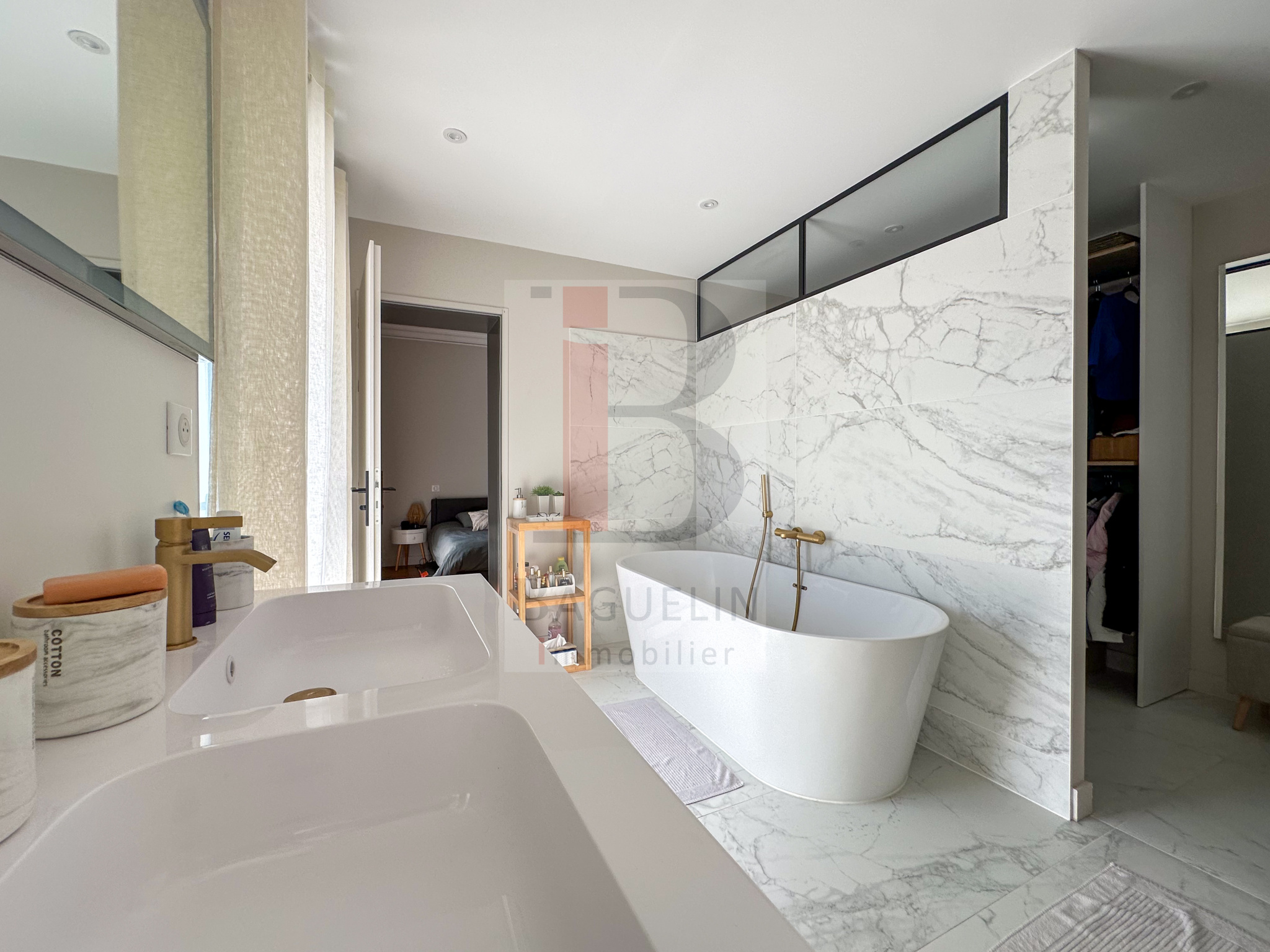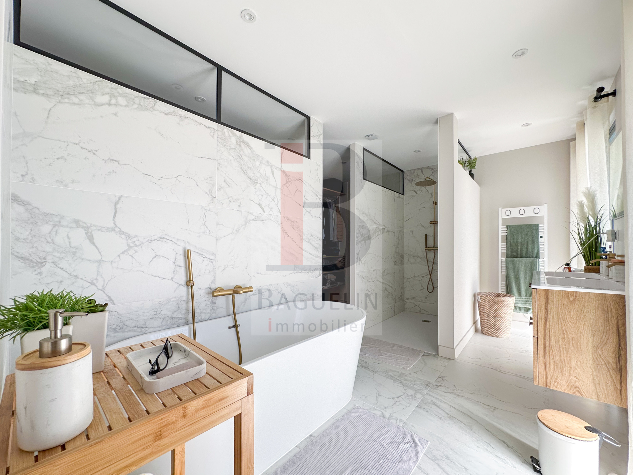Au 1er étage : une suite parentale avec salle de bains privative et dressing donnant sur une terrasse solarium, 2 chambres (l’une avec petite terrasse et l’autre avec balconnet), salle d’eau et toilettes séparés.